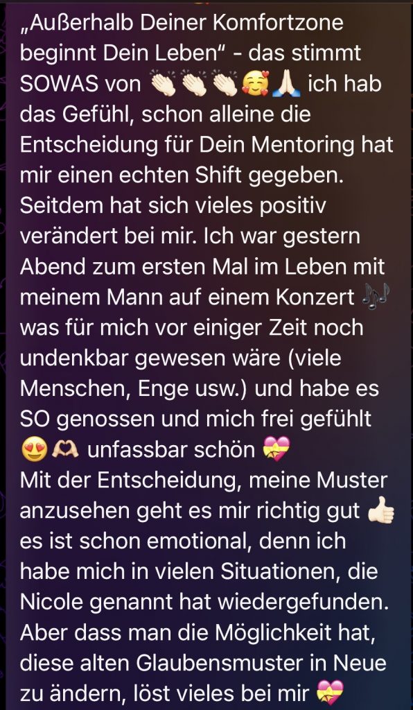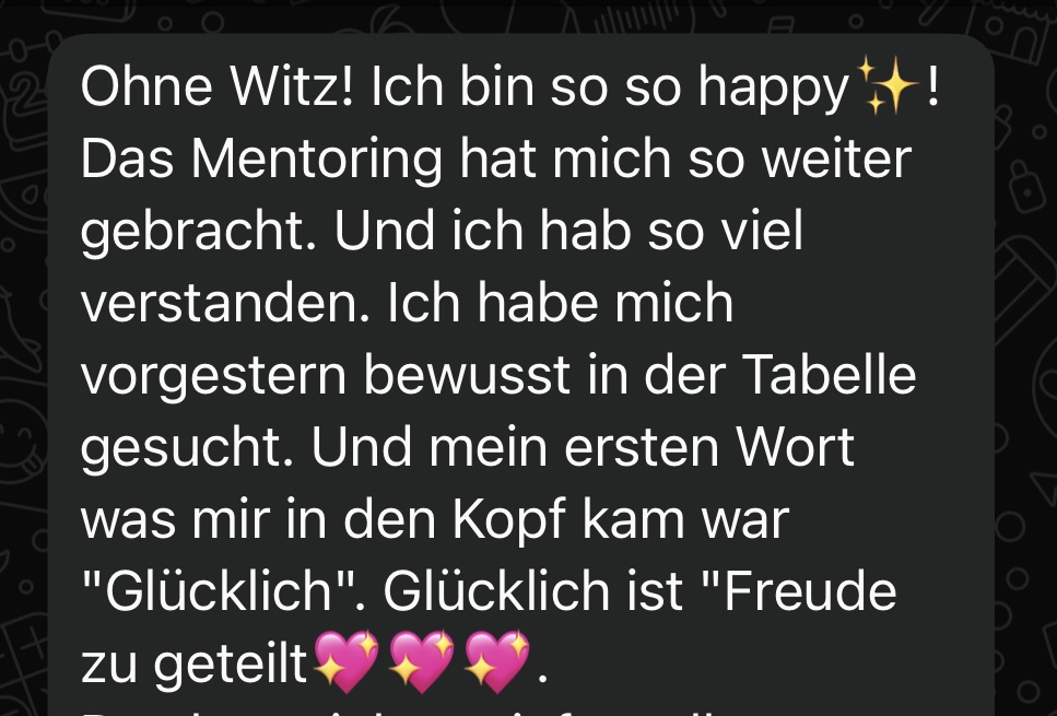 Und genau deshalb mache ich heute diese Arbeit. Meine Mentorings sind keine Mutmach-Coachings, kein Schönreden und vor allem kein „da musst du halt mal durch“. Ich arbeite mit dem, was deine Angst wirklich auslöst: deinen Mustern, deiner inneren Geschichte, deiner gespeicherten Erfahrung. Mit dem Teil in dir, der dich schützen will – und dich dabei festhält.